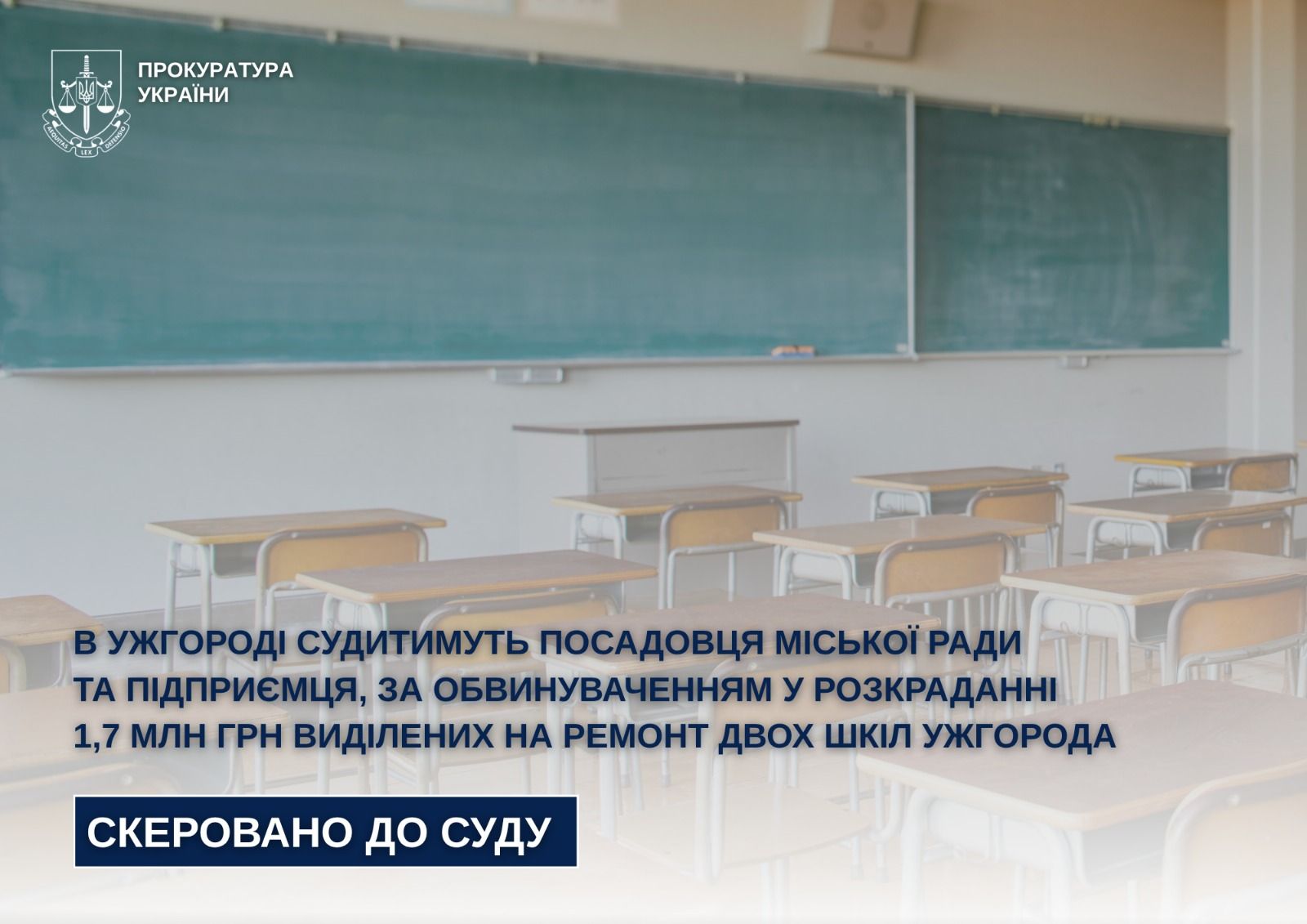 В Ужгороді судитимуть посадовця міської ради та підприємця, за обвинуваченням у розкраданні 1,7 млн грн виділених на ремонт двох шкіл Ужгорода. Про це інформують на сайті Закарпатської обласної прокуратури.